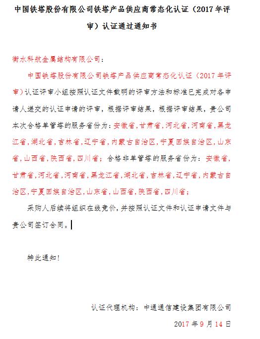我公司通過(guò)中國(guó)鐵塔股份有限公司鐵塔產(chǎn)品供應(yīng)商常態(tài)化認(rèn)證