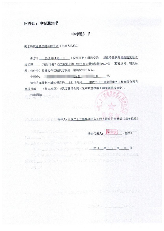 2017年4月1日,成功中標(biāo)新建哈佳鐵路賓西段貨運(yùn)改造工程CR23GDW-BXTL-2017-002 通訊鐵塔BXSD-01 中標(biāo)通知書見圖片